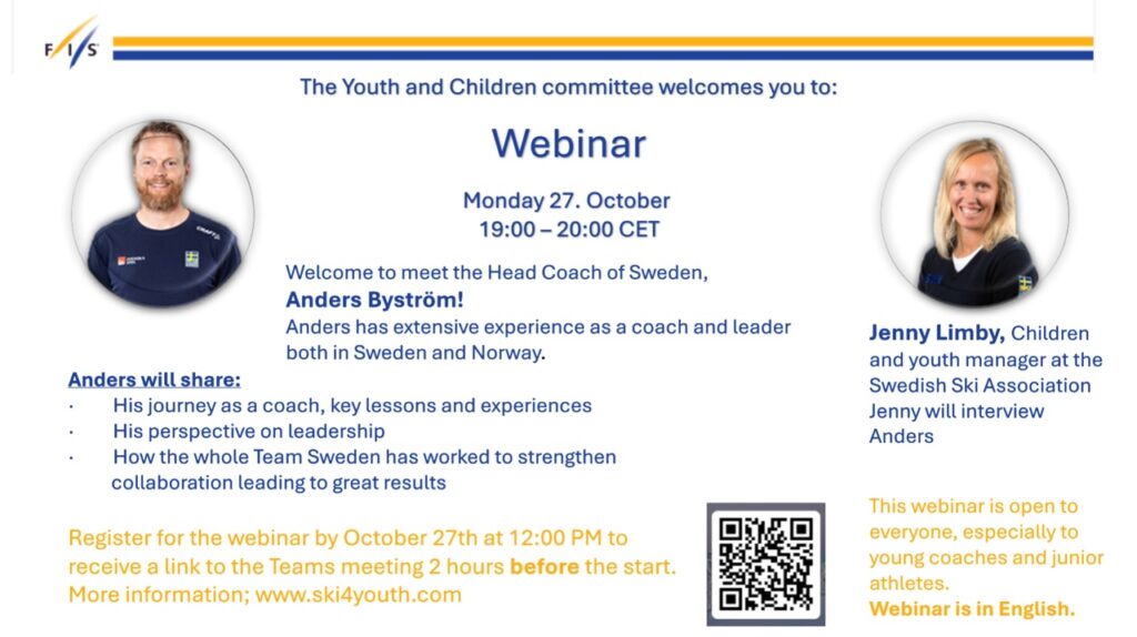 Kansainvälisen hiihtoliiton FIS:n maastohiihdon lasten ja nuorten alakomitea järjestää maanantaina 27.10.2025 klo 20-21 Suomen aikaa webinaarin, jossa pääset kuulemaan Ruotsin maastohiihtomaajoukkueen johtajan Anders Byströmin ajatuksia valmentamisesta ja johtamisesta.