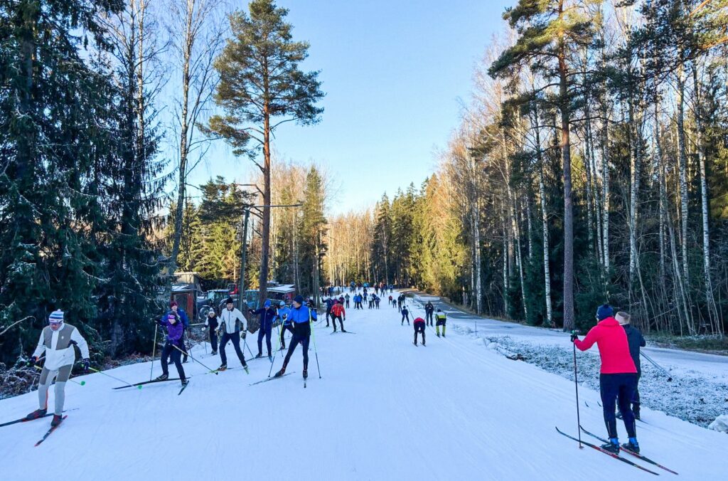 Hiihtäjiä Espoon Oittaalla 22.11.2025, jolloin noin kilometrin mittaista ensilumenlatua kierrettiin yhteensä 9800 kertaa. (Kuva: Asso Erävuoma)